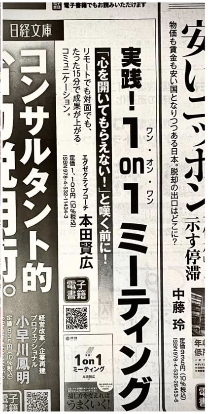 日経新聞に「実践!1on1ミーティング(日経文庫)」の 広告を出してくださいました。