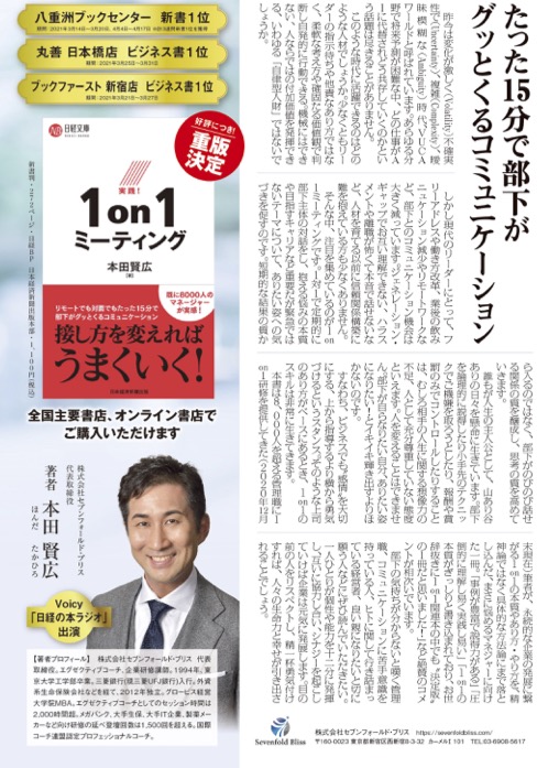 弊社代表 本田賢広の著書「実践!1on1ミーティング(日経文庫)」をご掲載いただきました。