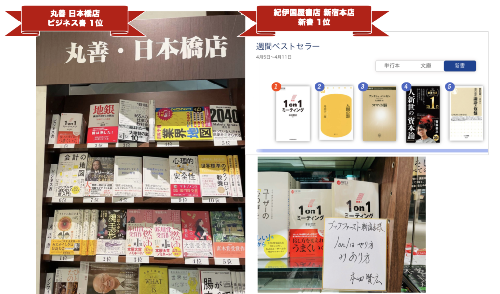 弊社代表の本田の著書「実践!1on1ミーティング」がお蔭様で書店ランキング1位をいただきました。