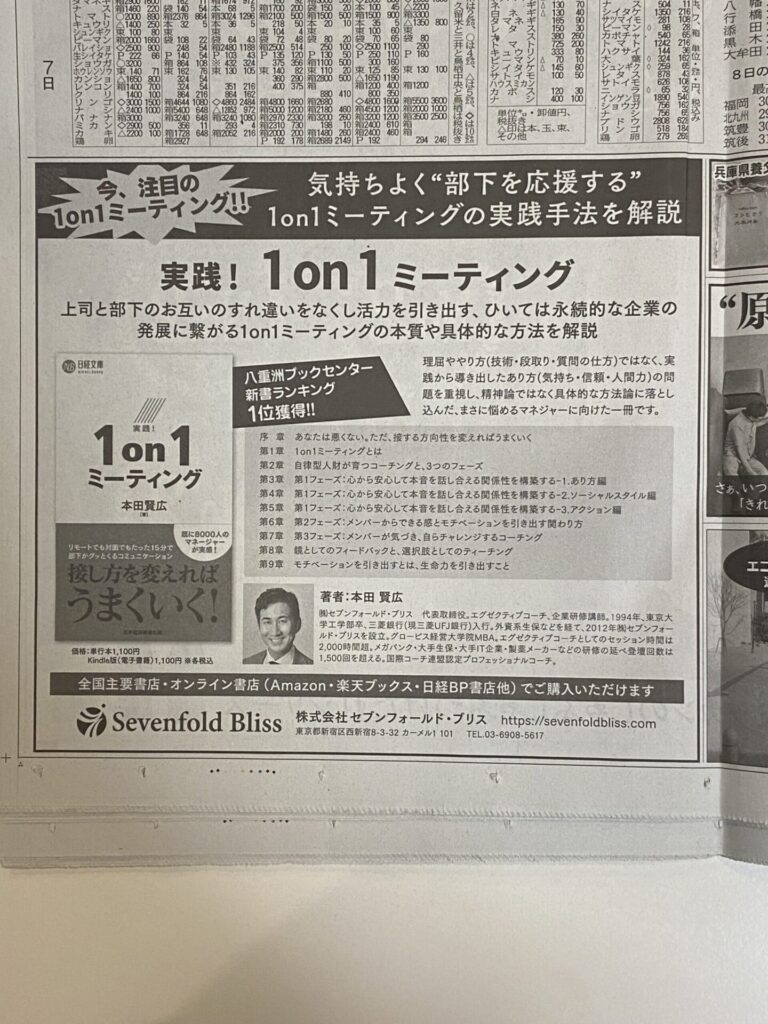 本日の西日本新聞(北九州版)に弊社代表 本田賢広の著書、「実践!1on1ミーティング(日本経済新聞出版)」を