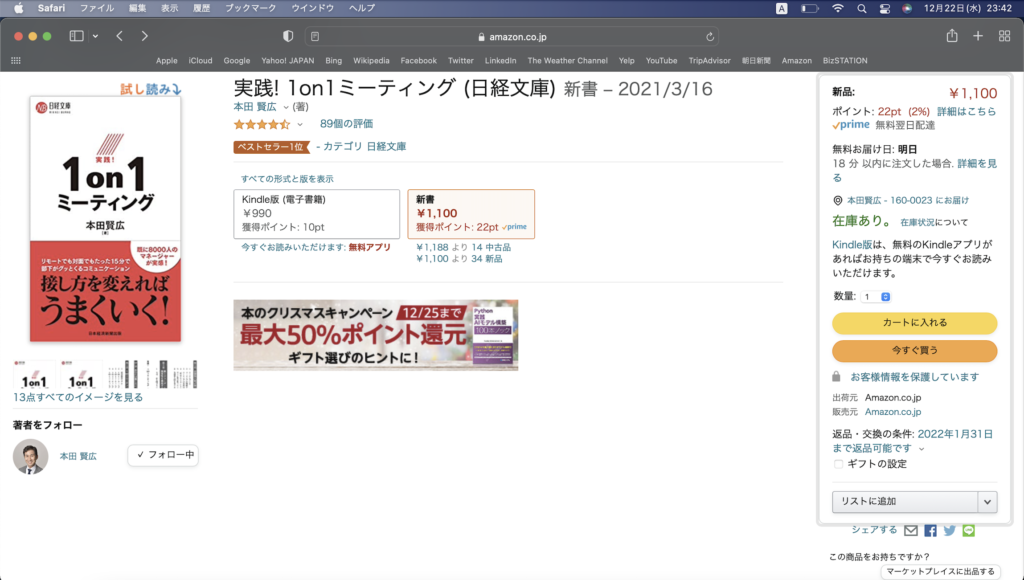 「実践!1on1ミーティング」 がAmazon「日経文庫の売れ筋 1位」にランクイン