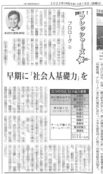 この度、日本金融通信社さまの発行部数10万部、日本最大の金融総合専門紙である「ニッキン」に弊社代表 本田賢広の「社会人基礎力」養成講座の内容をご掲載いただきましたので、お知らせいたします。(2022年3月18日号)