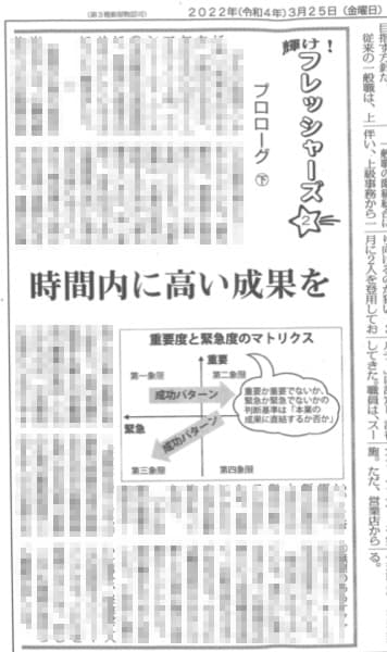 この度、3月24日の「社会人基礎力」養成講座に続き、「タイムマネジメント術」についても、日本金融通信社さまの発行部数10万部、日本最大の金融総合専門紙である「ニッキン」にご掲載いただきましたので、お知らせいたします。(2022年3月25日号)