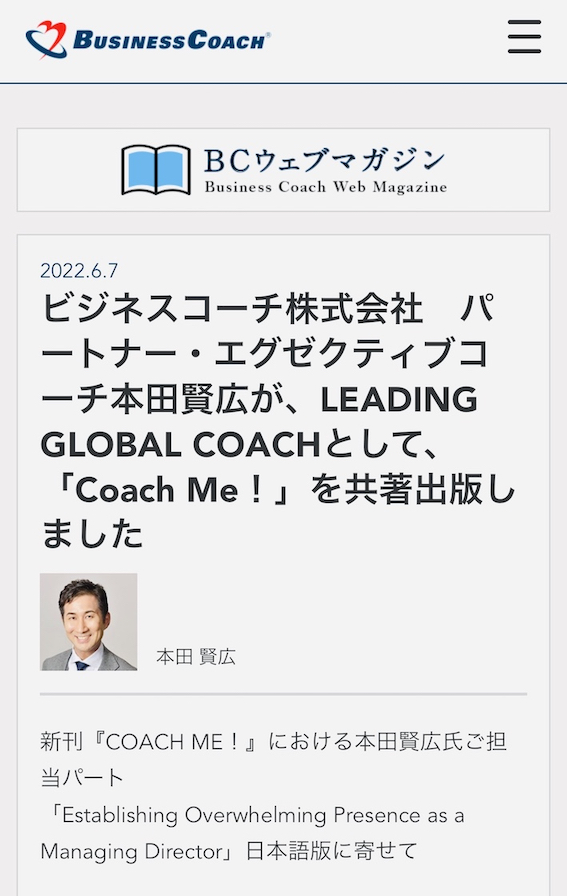 新刊『COACH ME!』について、ビジネスコーチ社様 WEBサイトに掲載いただきました
