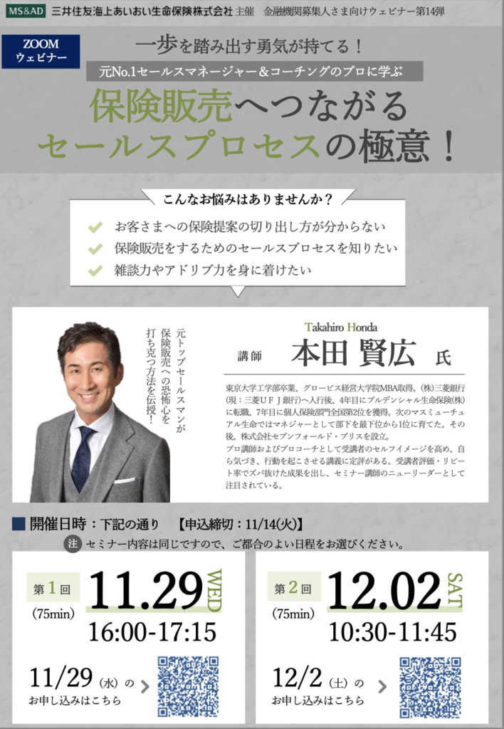 保険販売をされている銀行員の方向けに、三井住友海上あいおい生命保険様主催で、ウェビナー講演させていただきました。