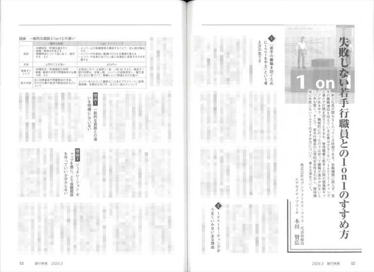 この度、銀行実務3月号に、弊社 代表の本田が「失敗しない 若手行職員との1on1のすすめ方」を寄稿させていただきました。