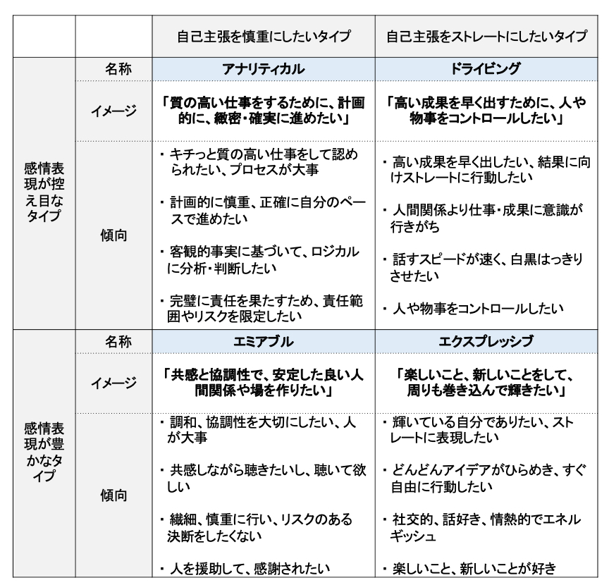 人のコミュニケーションの取り方を「感情表現」と「自己主張」の2軸で捉え、2×2で4つのスタイルに分類する考え方です(下表ご参照)。