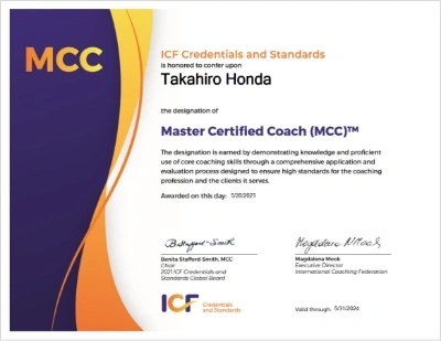 国際コーチング連盟(ICF)による認定資格「マスター認定コーチ(MCC)」は、国際的に最高クラスと認められた真のプロフェッショナルコーチの証です。日本のコーチング業界30年の歴史で認定されているのは未だ累計68名のみで、本田賢広はその一人です。